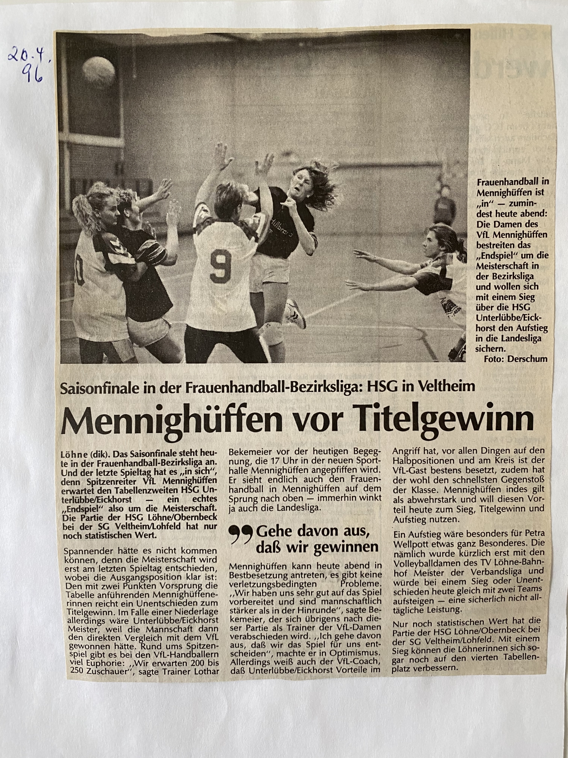 In der Saison 1995/96 machten zum ersten Mal unsere Damen von sich reden. Die von Lothar Bekemeier trainierte Truppe schaffte in dieser Spielzeit den Aufstieg in die Landesliga. In der Bezirksliga Staffel 1 patzten unsere Damen zunächst bei ihren Heimauftritten.Zum Saisonauftakt kam man vor eigenem Publikum gegen SC Bielefeld (11:11) und TVG Nordhemmern/Mindenerwald (13:13) nur zu zwei Unentschieden. Dann aber wurden unsere Damen immer stärker und übernahmen am siebten Spieltag bei 12:2-Punkten die Tabellenführung. Am achten Spieltag kam es dann in der Mennighüffer Sporthalle zum Derby mit der HSG Löhne/Obernbeck. Kurz nach dem Wechsel führte der VfL mit 10:8-Toren. Die HSG konnte beim 10:10 ausgleichen, doch danach erhöhte der VfL auf 14:10 und gewann verdient mit 15:12-Toren. Während bei der HSG Petra Wellpott sechsmal ins Schwarze traf, führte auf seiten des VfL Anja Kracht mit zehn Treffern die Torschützenliste an. In der nächsten Partie zeigten unsere Damen bei der Bundesligareserve des HSV Minden/Minderheide eine beeindruckende Vorstellung und siegte überraschend mit 14:16-Toren. Dabei waren Nicole Walter und Sylke Windel jeweils viermal erfolgreich.