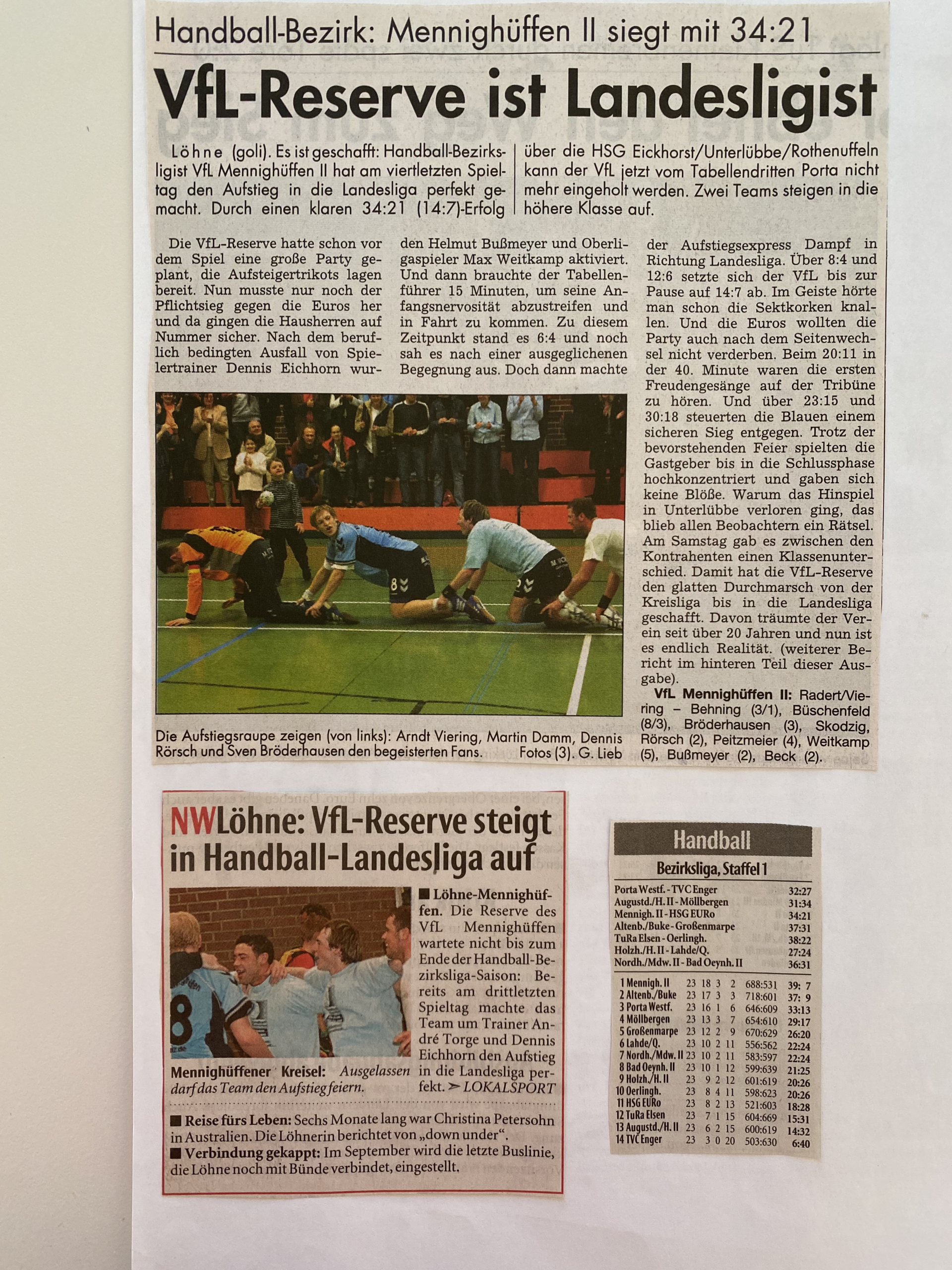 Der Klassenerhalt sollte es sein, am Ende war es der Gewinn der Meisterschaft und der Aufstieg in die Landesliga. Nur zwei Niederlagen gab es für unsere Reserve . Zudem kam man dreimal über eine Punkteteilung nicht hinaus. Aber am Ende stand die Truppe von Dennis Eichhorn und Andre Torge mit 45:7-Punkten und 775:593-Toren auf dem Platz an der Sonne. Vizemeister wurde mit 43:9-Zähler die HSG Altenbeken/Buke, die ebenfalls den Aufstieg schaffte. In der Endabrechnung landete die HSG Porta Westfalica auf Platz drei. Aber mit 36:16-Punkten lagen die Mindener satte neun Punkte hinter unserer Truppe. Gleich zu Saisonbeginn gab es in Eidinghausen das Derby mit der zweiten Mannschaft des HCE Bad Oeynhausen. Der VfL führte wenige Sekunden vor dem Ende mit 19:20-Toren, doch gerade Maik Tacke traf gegen seine ehemaligen Kameraden fast mit dem Schlusspfiff zum 20:20-Ausgleichstreffer. Und danach begann der Siegeszug des VfL. Acht Spiele in Folge blieb unsere Reserve ungeschlagen, ehe sie völlig überraschend beim Tabellenletzten HSG Euro mit 20:22-Toren verlor. Am siebten Spieltag siegte unsere Truppe klar mit 27:34-Toren beim Tabellenführer HSG Altenbeken/Buke und sprang auf den Platz an der Sonne. Nach Beendigung der ersten Serie grüßte der VfL mit 23:3-Punkten als Herbstmeister. Auf den Plätzen zwei und drei rangierten die HSG Altenbeken/Buke (21:5) und der TuS Möllbergen (18:8).